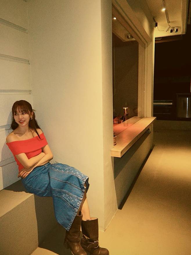 사진 속 윤은혜의 패션은 ‘캐주얼 글램(Casual Glam)’의 완벽한 예시였습니다. 시선을 단번에 사로잡는 과감한 레드 컬러의 오프숄더 톱은 그녀의 가녀린 어깨선과 쇄골을 드러내며 여성미를 극대화했습니다.