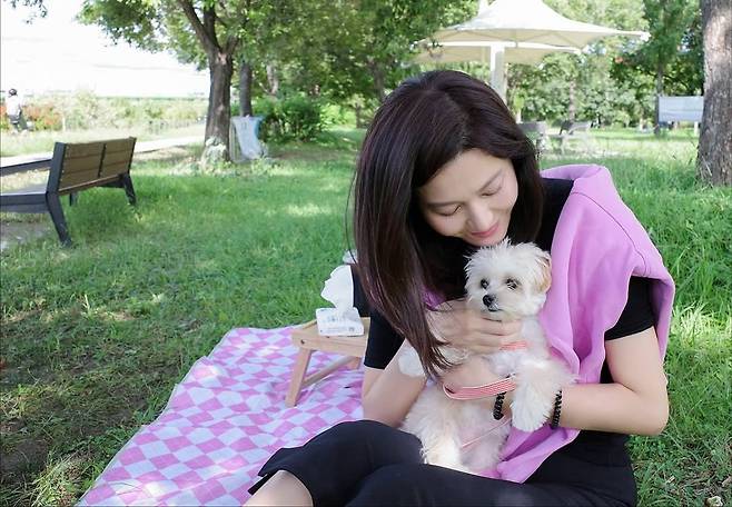 반려견을 품에 안고 짓는 환한 미소는 세월을 잊은 듯한 청순한 미모를 더욱 돋보이게 합니다.