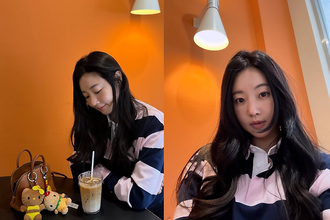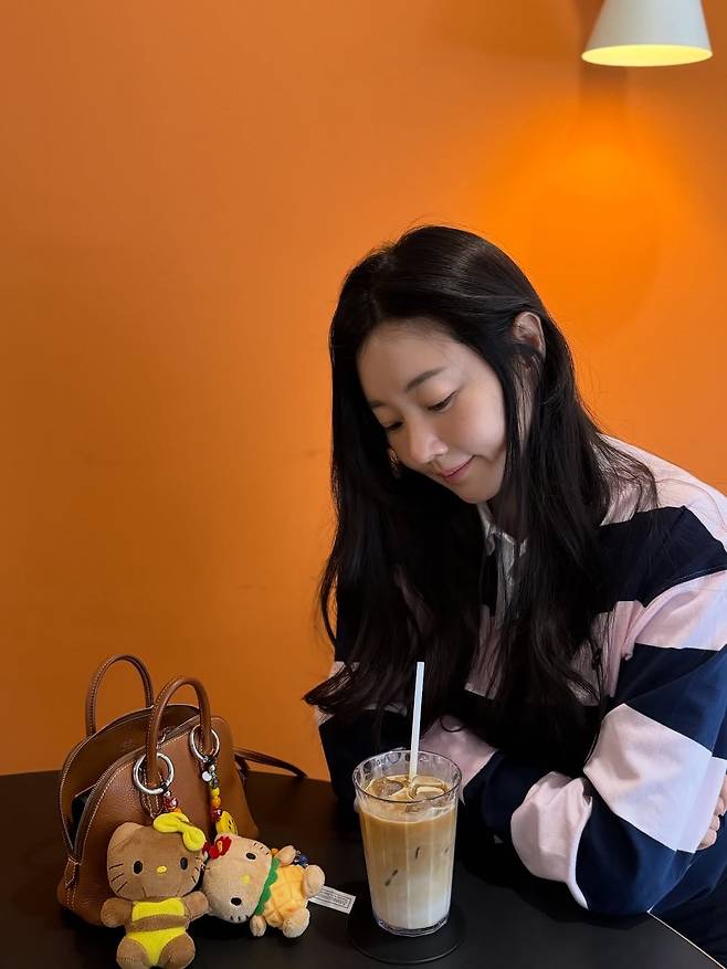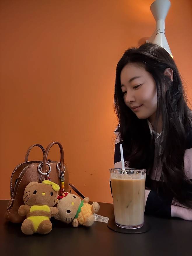 특히 그녀의 가방에 달린 귀여운 인형이 눈에 띕니다. 소녀 같은 취향은 그녀의 동안 미모와 잘 어울립니다.