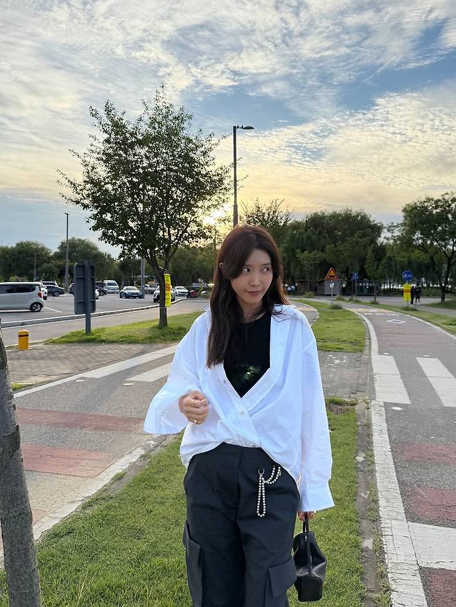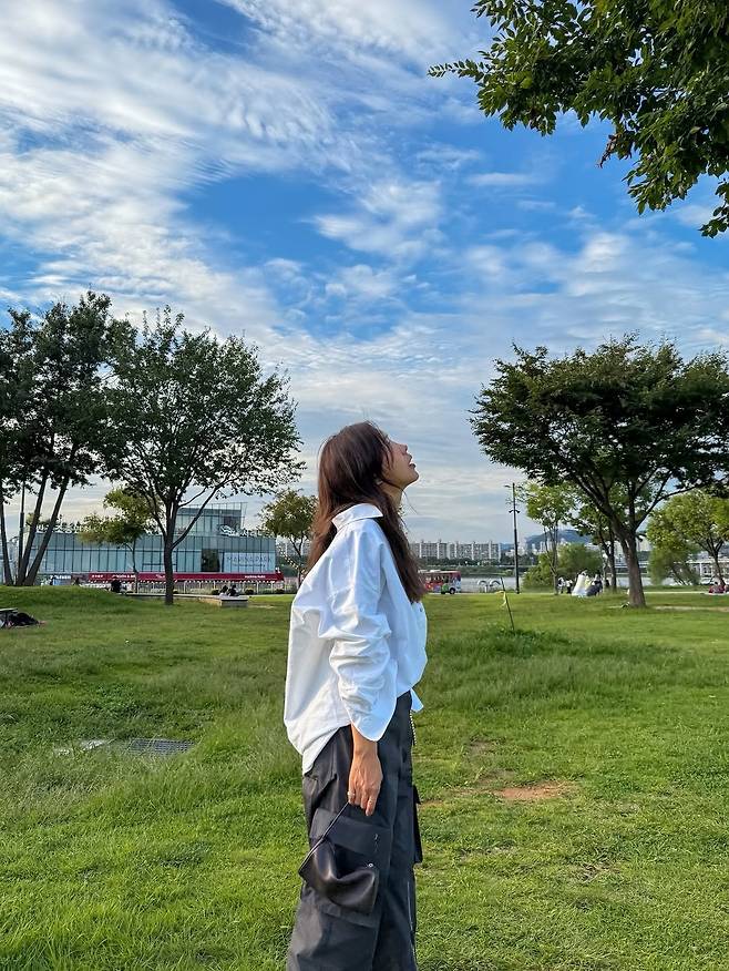 사진 속 그녀는 박시한 흰 셔츠에 카고 팬츠를 입었죠. 가을에 딱 어울리는 ‘꾸안꾸’ 스타일링입니다.