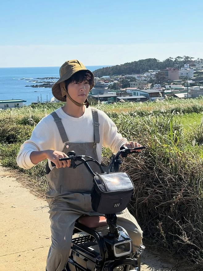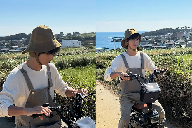 사진 속 그는 멜빵바지를 입고 스쿠터를 타고 있습니다. 카키색 버킷햇이 귀여운 매력을 한껏 더해주고 있네요.