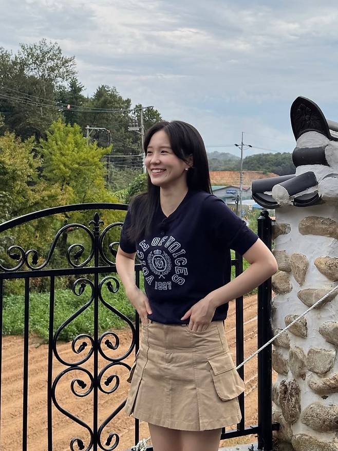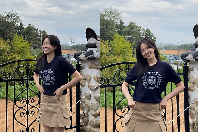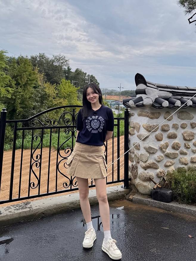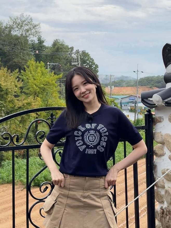사진 속 장예원은 빈티지한 프린팅이 돋보이는 네이비 티셔츠에 베이지색 카고 미니스커트를 매치해 편안한 룩을 연출했습니다.
