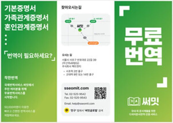 “가족·기본·혼인증명서 번역료 0원.”…써밋 글로벌지원센터, 강남구 주민에게 공문서 무료 영어 번역 서비스 제공 AI 기반 공문서 다국어 번역 및 인증 서비스 ‘써밋 글로벌지원센터’를 운영하는 팩트앤지가 강남구 주민을 대상으로 가족관계증명서, 기본증명서, 혼인관계증명서 무료 영어 번역 서비스를 제공한다고 16일 밝혔다.강남구청 산하 22개 주민센터에 홍보 리플렛이 배포될 예정이며, 리플렛의 QR코드를 핸드폰 카메라로 스캔하여 써밋 글로벌지원센터 홈페이지에 접속한 후 2024.07.17