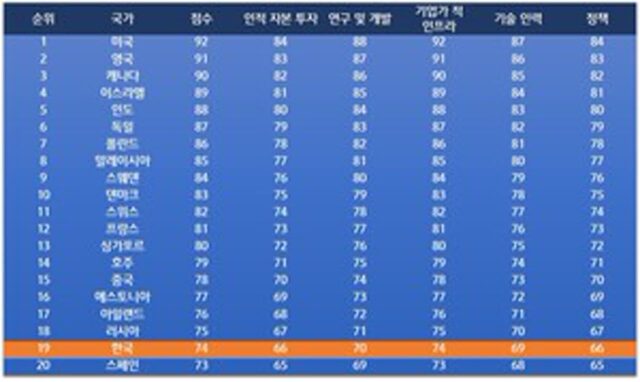 [랭킹뉴스] 2024년 세계에서 스타트업 친화적인 국가 순위 TOP20 CEOWORLD 매거진의 연례 평가에 따르면, 미국이 세계에서 가장 스타트업 친화적인 국가로 선정되었다. 인도는 5위를 차지했으며, 이스라엘이 4위, 캐나다가 3위, 영국이 2위를 기록했다. 한국은 총점 74점으로 러시아에 이어 19위를 기록했다. 이번 순위는 과학 및 기술 중심 경제에서 국가의 경쟁력과 역량을 평가하여 결정되었다.미국은 연구개발(R&D) 2024.07.10