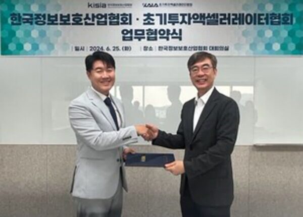 초기투자액셀러레이터협회, 한국정보보호산업협회와 업무협약 체결 초기투자액셀러레이터협회(협회장 전화성)는 한국정보보호산업협회와 국내 정보보호 산업 경쟁력 강화 및 투자 활성화를 위한 업무협약을 체결했다고 25일 밝혔다.이번 협약식에는 초기투자액셀러레이터협회 전화성 협회장과 한국정보보호산업협회 조영철 협회장이 참석한 가운데 진행됐다.양 기관은 이번 협약을 통해 국내 정보보호 산업 발전 협력을 약속하며, △정보보호 산업 분 2024.06.25