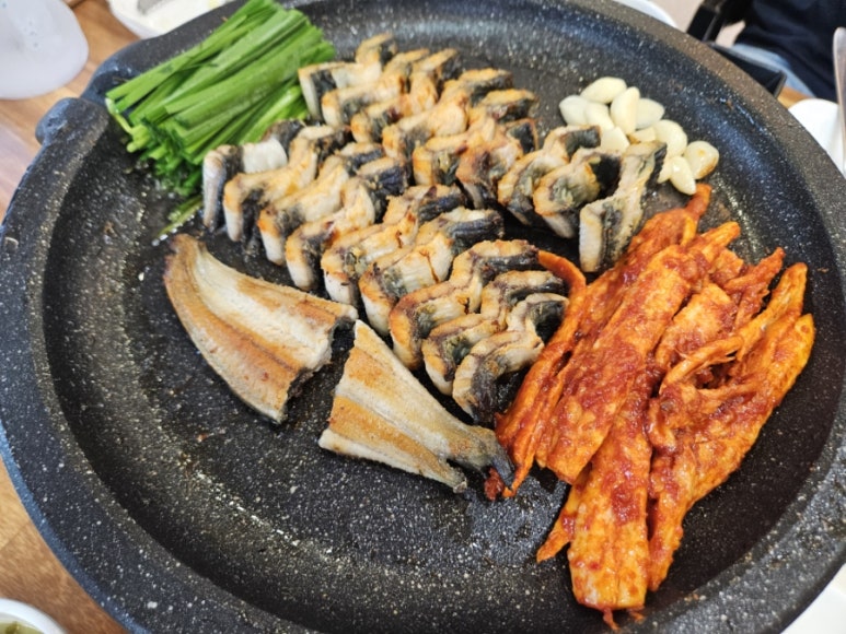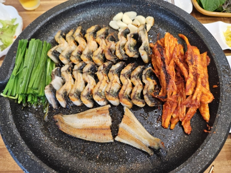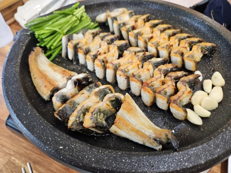 장어구이 1Kg은 두 마리로 돌판에 맛있게 구워서 나오기 때문에 먹기 편했고 기름튀기며 굽지 않아도 되니깐 만족스럽다. 노릇노릇 골고루 익혀서 나왔고 살도 통통하니 먹음직스럽다.