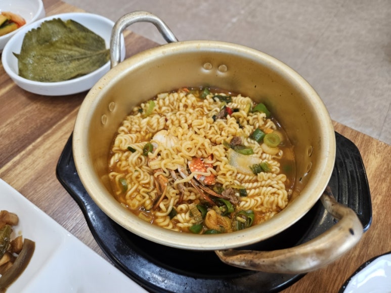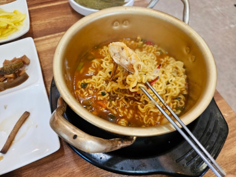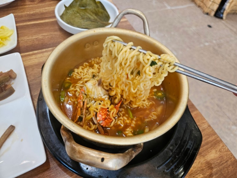 장어탕은 조금 무거울 것 같아서 꽃게 냄비 라면을 먹었는데 국물에 꽃게가 들어가 감칠맛이 올라간 라면이고 냄비 라면이라 더 맛있다. 장어구이 먹은 후 해장 라면 느낌으로 먹기 좋다.