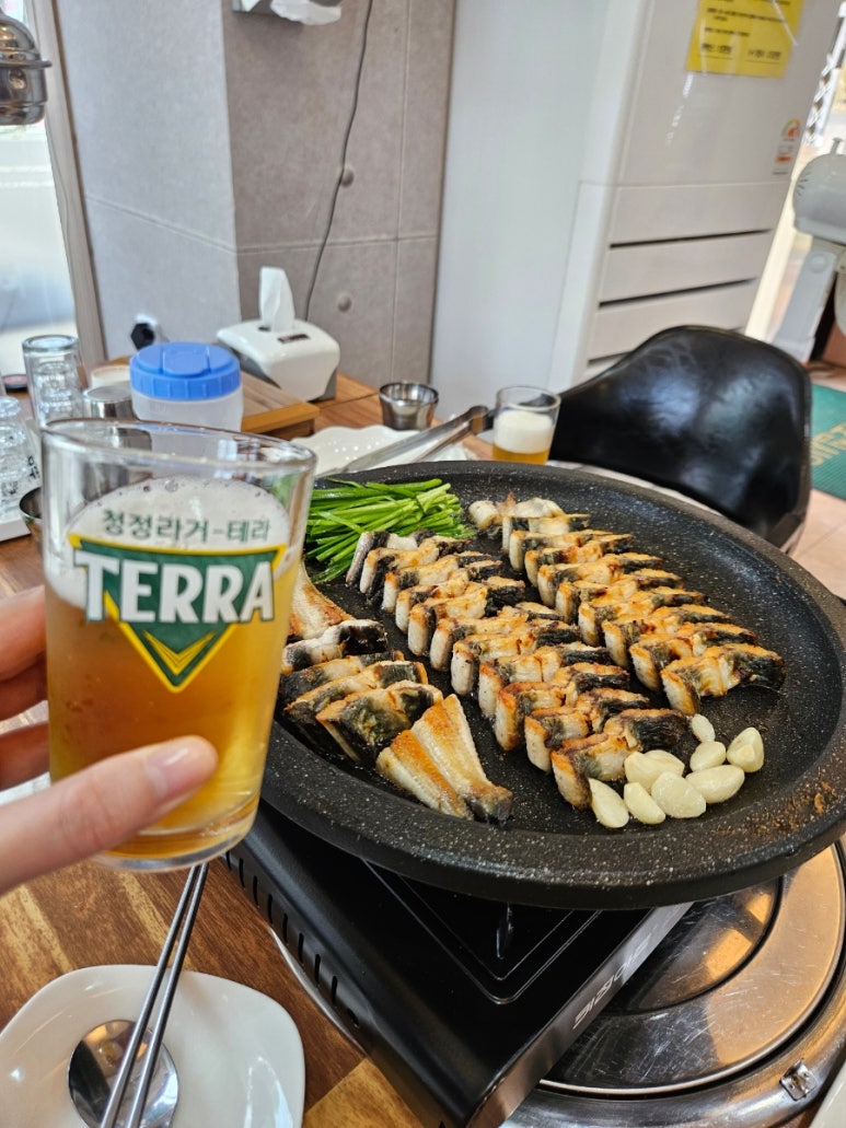 맛있는 맥주도 한잔했는데 장어구이와 궁합이 좋다. 장어 특유의 고소하고 담백한 맛이 좋은 스태미너 보양식이다. 구운 마늘과 부추와 같이 곁들이니 더 맛있는 풍천민물장어구이다.