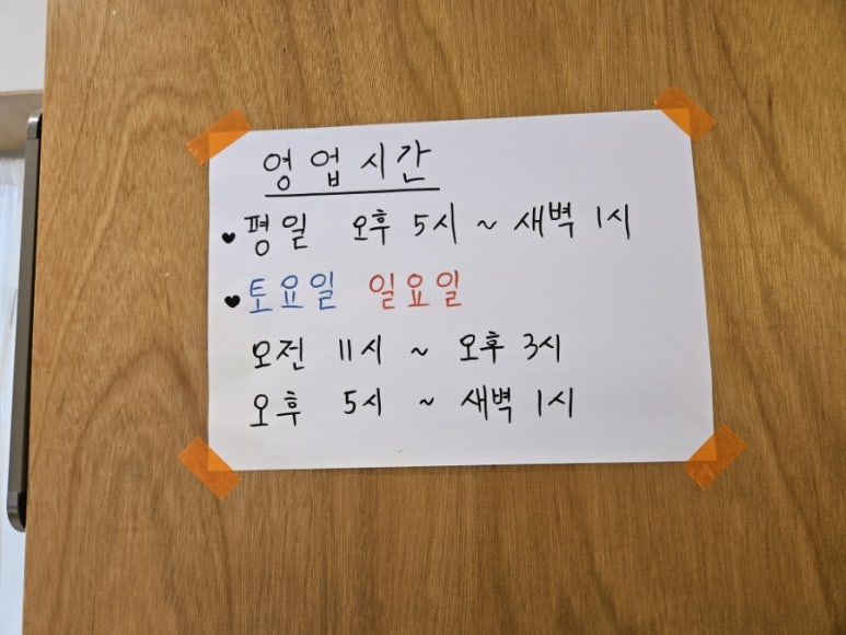 영업시간은 평일 오후 5시부터 새벽 1시까지고 토요일 일요일은 오전 11시부터 오후 3시까지 영업하고 있다.
