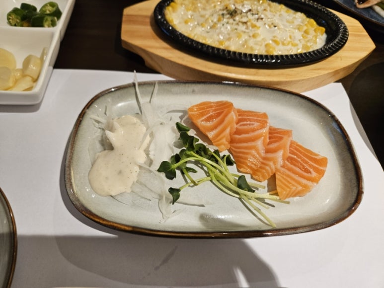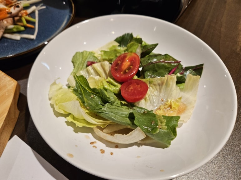 샐러드는 애피타이저로 딱인데 신선한 양상추와 방울토마토 오리엔탈 드레싱이 회를 먹기 전 입맛 돋우기 좋다.