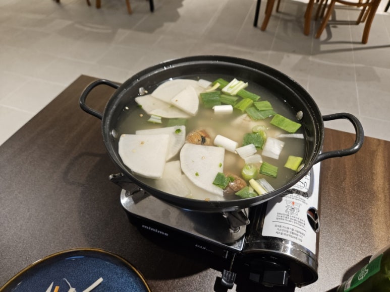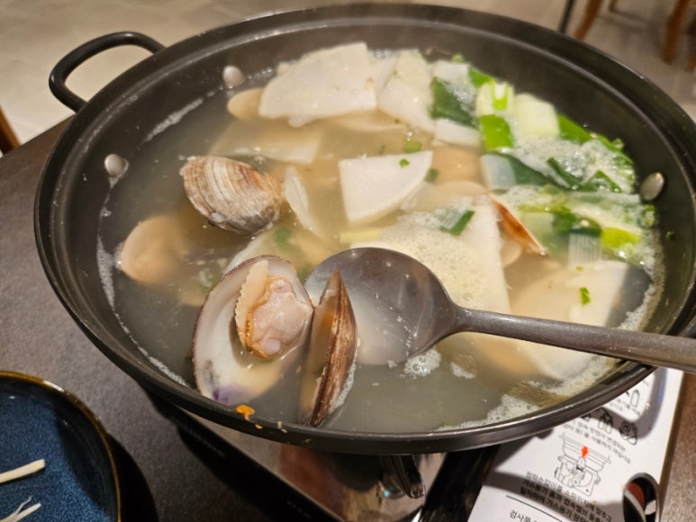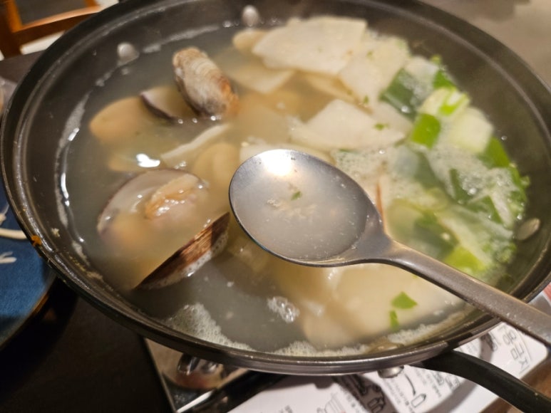 팔팔 끓이면 조개가 입을 여는 순간이 온다. 그때 먹으면 되는데 조개살은 쫄깃하니 씹는 맛이 있고 국물이 진짜 맛있어서 국물을 많이 먹고 왔다. 무가 많이 들어가서 국물이 시원했던 것 같다.