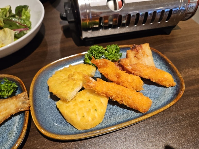 튀김요리도 안 나오면 아쉬운데 새우튀김과 고구마튀김 멘보샤 튀김까지 준비된다.