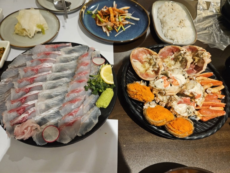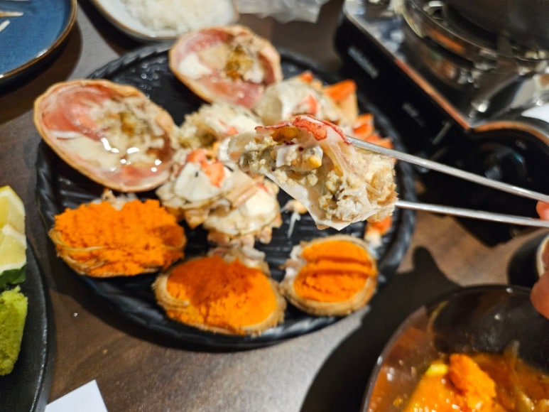드디어 메인메뉴 빵게세트가 나왔다. 어선당에만 있는 메뉴라고 생각되는데 빵게가 모듬회가 함께 나온다. 빵게는 알과 함께 푸짐하게 나온다. 게딱지에 밥을 넣어서 비벼 먹어도 좋고 회도 먹고 빵게도 먹고 같이 먹기 좋다. 빵게 2인 세트는 69,000원 3인세트는 99,000원이었다.