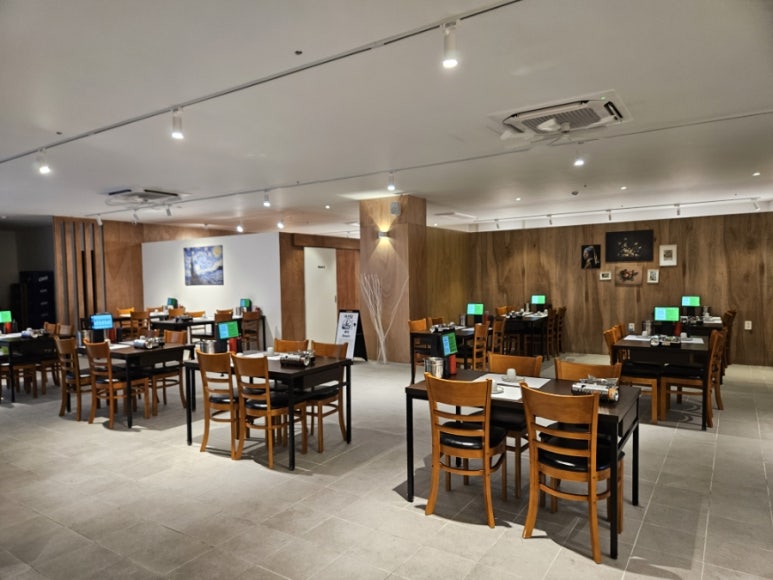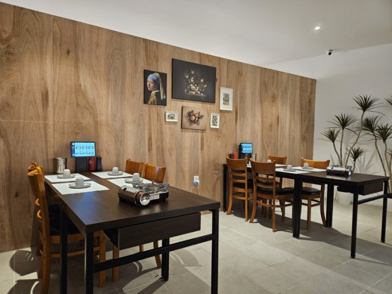 내부가 넓어서 놀랐다. 넓어서 가족 모임 단체 모임 하기에도 좋아 보였다. 무엇보다 넓으니깐 테이블 간격이 넓어서 옆자리 신경 덜 쓰고 편하게 식사할 수 있어서 좋았다. 인테리어는 우드톤 벽과 원목 테이블이 고급스럽지만 따뜻한 분위기를 낸다. 한쪽 벽면에 명화도 걸려 있어서 포인트도 되어준다.