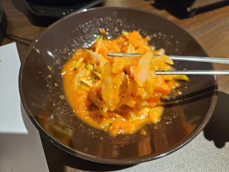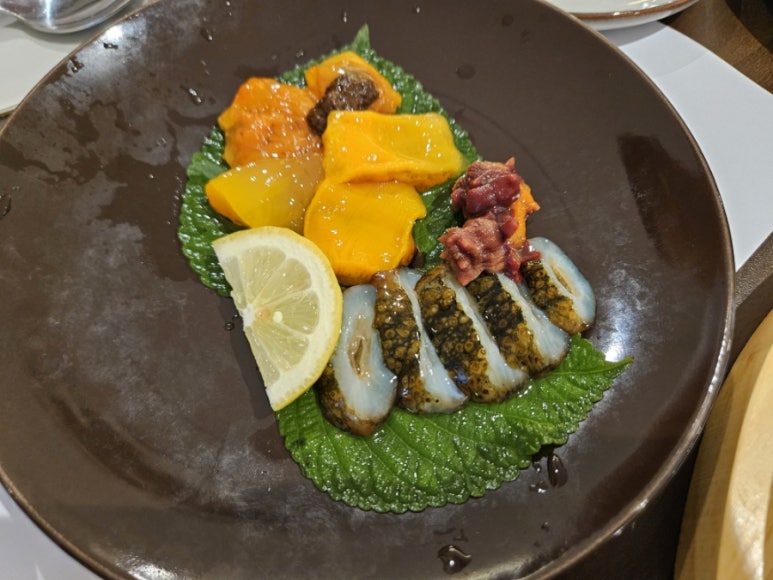 해산물은 멍게와 해삼이 깔끔하게 준비된다. 바다향 가득한 멍게와 탱글한 해삼이 함께 담겨있고 씹을수록 바다의 풍미가 입안에 퍼진다.