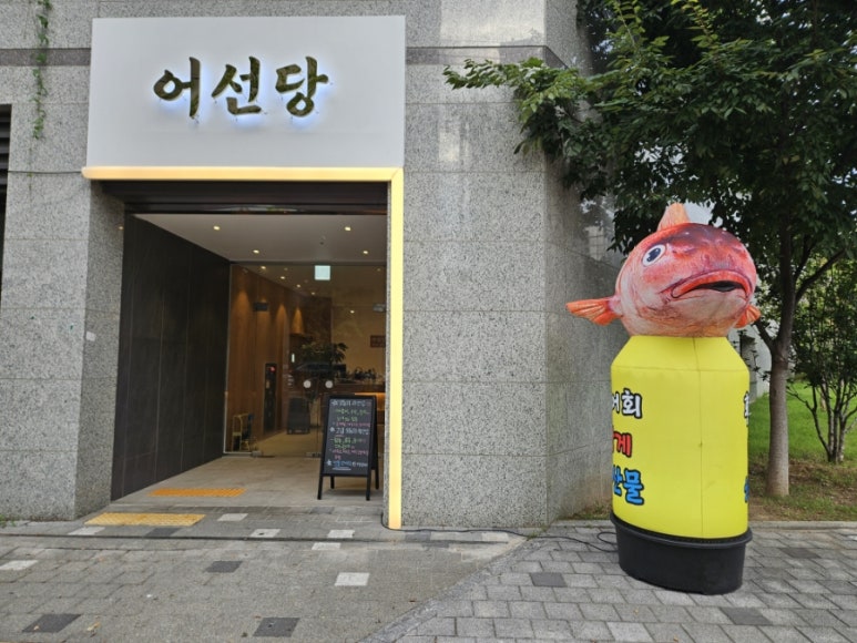 반고개역에서 가까운 곳에 새로 생긴 횟집 어선당 스끼다시가 잘 나와서 반하고 온 대구 회 맛집이다. 입구는 좁아 보이는데 안으로 들어가면 100평 규모의 넓은 횟집으로 단체 예약하기도 좋은 횟집이었다. 외관부터 깔끔하고 심플한 간판에 금색 포인트가 인상적이다.