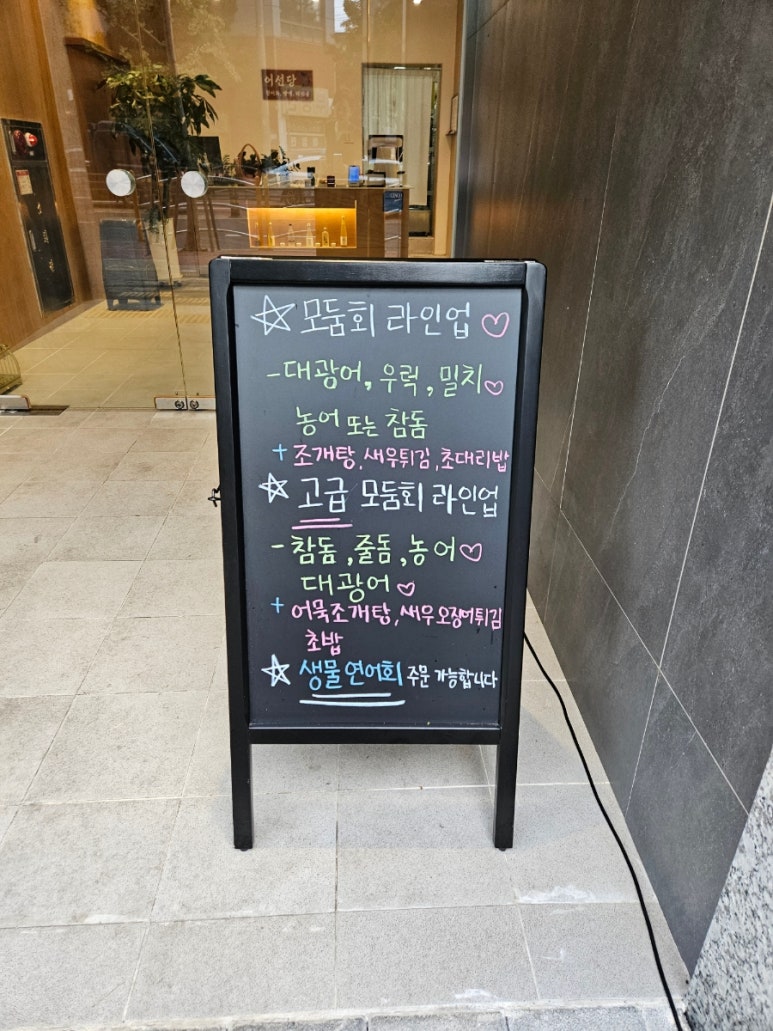 들어가는 입구에 보이는 입간판을 보니 모듬회 라인업이 적혀있었다. 대광어 우럭 밀치 농어 또는 참돔이 있고 모듬회에 조개탕 튀김 초대리밥까지 푸짐하게 먹을 수 있다.