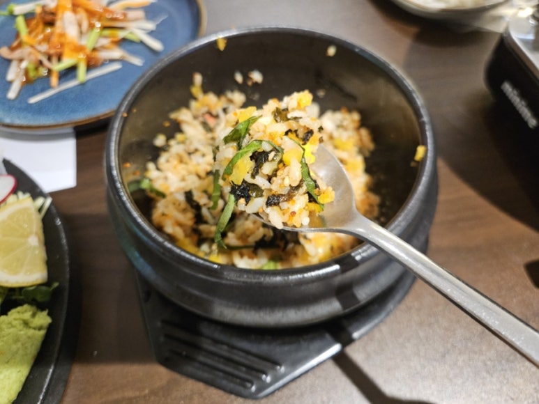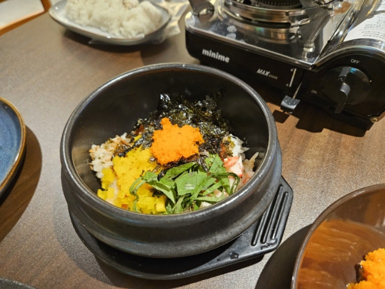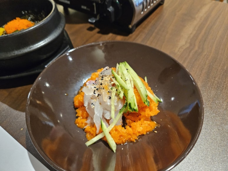 알밥은 뜨근한 뚝배기에 날치알 김가루 단무지 깻잎 맛살이 들어가 고소함과 톡톡 터지는 식감이 어우러져 든든한 스끼다시였다.밥 따로 안 먹어도 될 정도로 잘 나오는 스끼다시에 계속 감동했다.