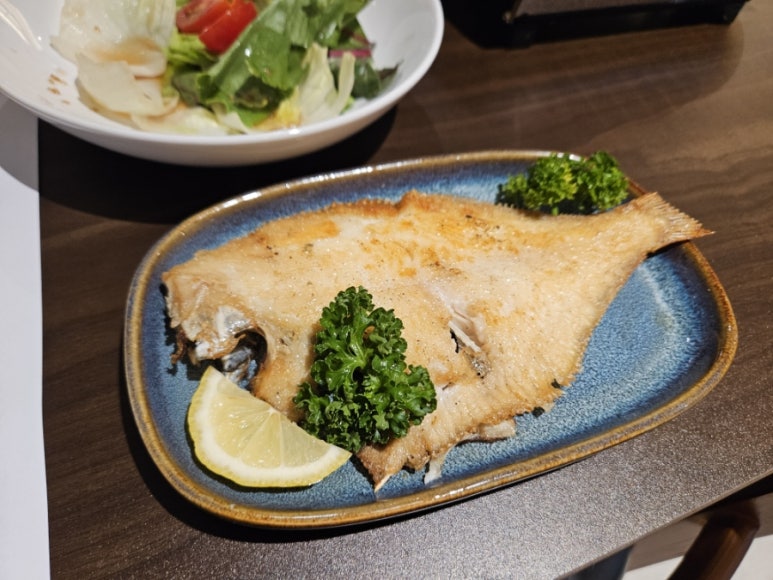 생선구이 중에 가자미구이가 맛있는데 가자미 구이도 하나 통으로 나온다. 꽁치보다 가자미구이가 담백하니 맛있다. 겉은 바삭하고 속은 촉촉하게 구워졌고 금방 구워 나오니 맛있을 수밖에 없다. 회와는 또 다른 매력이 있는 생선구이다.