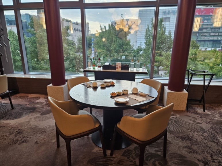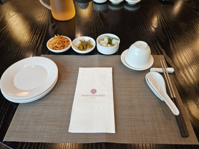 우리는 디너 코스로 예약을 하고 방문을 하니 상이 차려져있었다. 원형 테이블에 창이 넓어서 바깥 풍경도 좋다. 시야가 트여있어서 답답한 느낌이 없어서 더 좋았던 대구 중식 맛집 인터불고 엑스코 호텔 동보성이다.