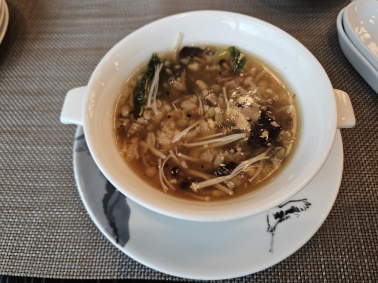 먼저 나온 건 누룽지 스프로 버섯류와 채소 누룽지가 어우러져 있고 속을 따뜻하게 풀어주면서도 부담스럽지 않아서 디너 코스 요리 첫 스타트로 좋았다.