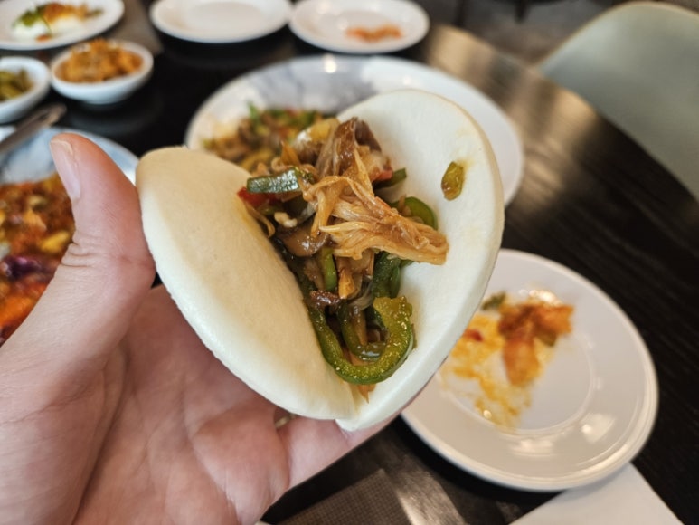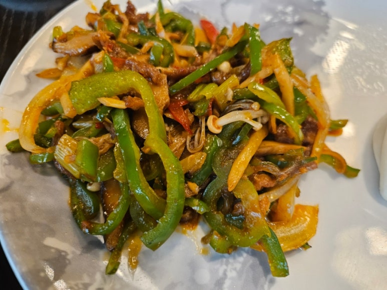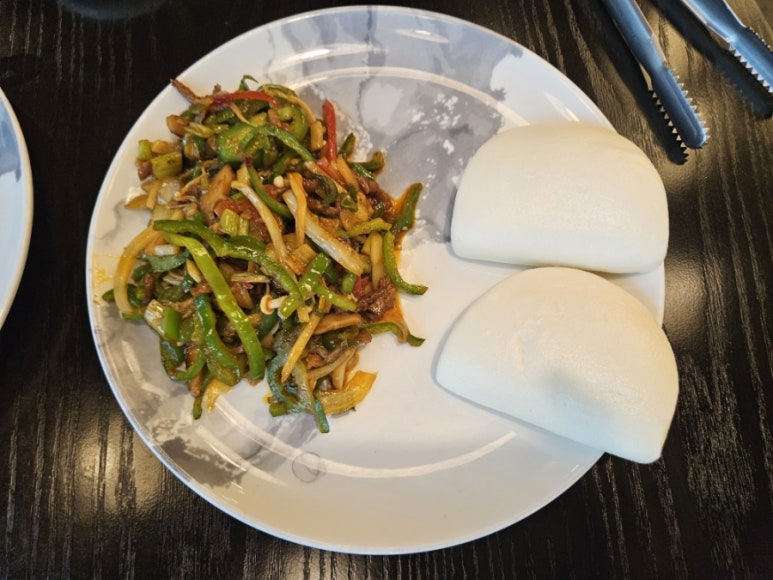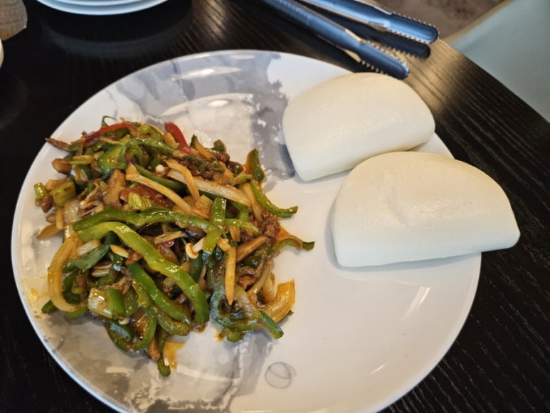 고추잡채 양념이 맛있었는데 피망은 아삭한 식감에 꽃빵에 넣어서 곁들여 먹으니 잘 어울린다. 고추잡채를 꽃빵에 싸 먹으면 매콤한 볶음과 담백한 빵이 만나 균형이 완성된다.