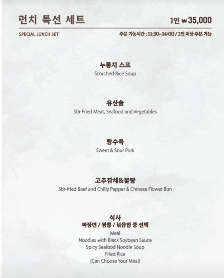 동보성 런치 특선 세트 1인 35,000원으로 점심 전용(11:30~14:00)으로 운영되며, 2인 이상 주문이 가능하다.