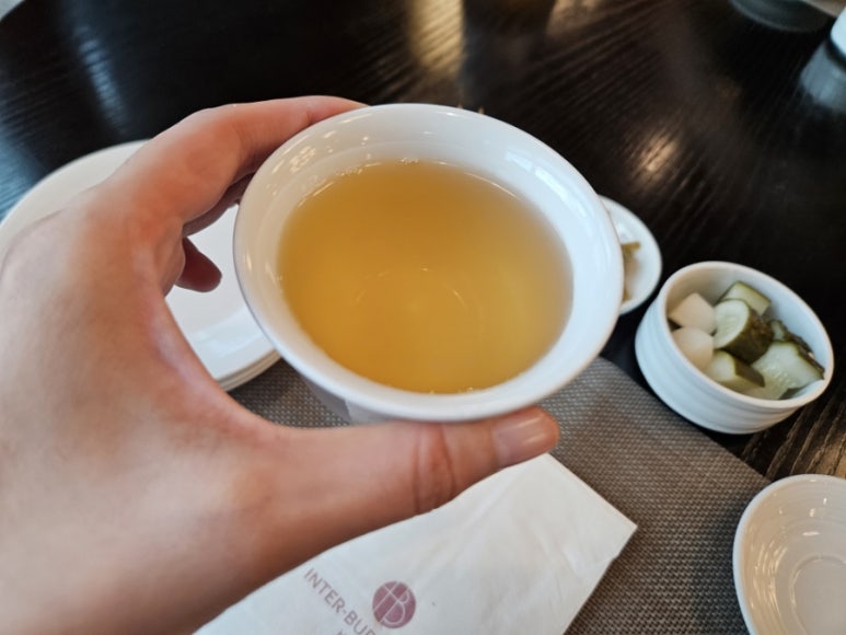 디너 특선 코스 기본 밑찬이 세팅되어 있고 여유 있는 앞접시와 수저와 젓가락까지 정갈하게 놓여있다. 시원한 물도 계피향도 나고 산뜻한 차라서 중식과 잘 어울렸다.