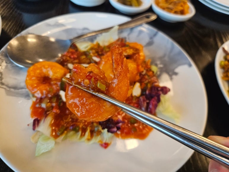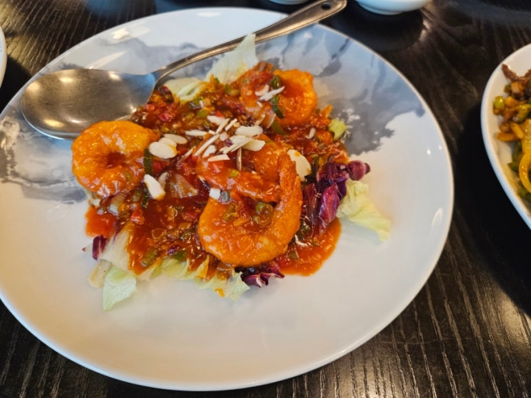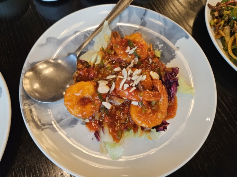 다음에 나온 게 칠리새우로 탱탱하게 살이 오른 새우를 바삭하게 튀겨내서 칠리소스에 버무린 중국요리다. 칠리새우는 좋아하는 요리라서 맛있게 먹었고 튀김이 눅눅하지도 않고 쫄깃한 식감이 특히 좋았다. 소스는 은은하게 매운맛에 달콤 새콤함까지 더해져 남녀노소 누구나 좋아할 맛이다. 코스 요리의 하이라이트 같은 요리다.