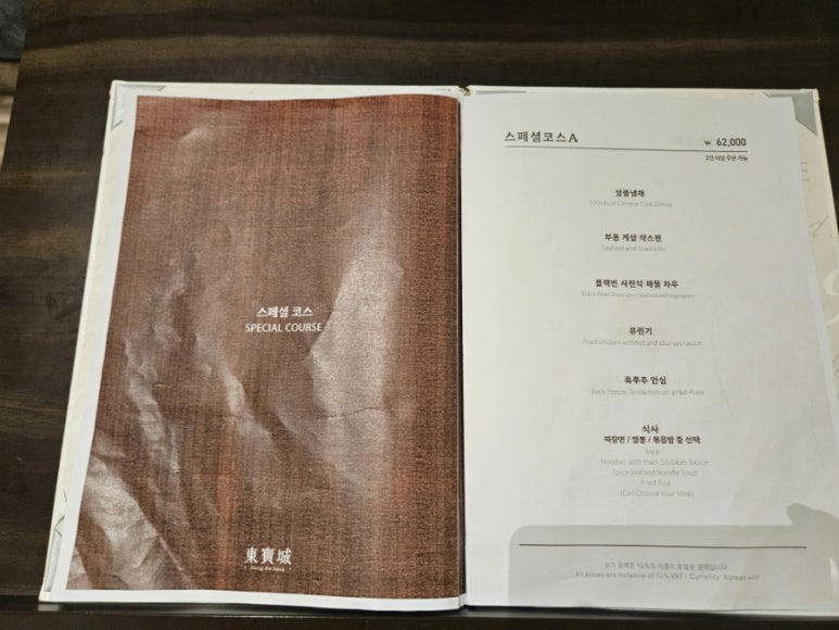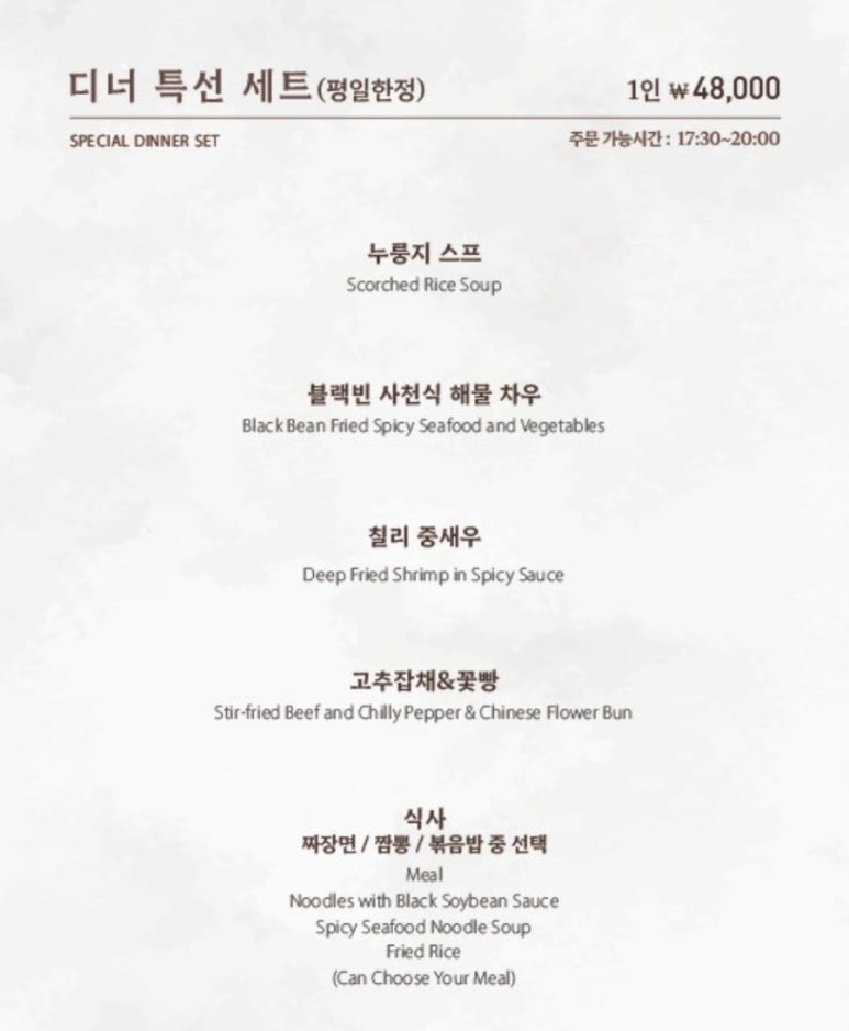동보성 디너 특선 세트 1인 48,000원, 평일 한정으로 주문 가능 시간은 저녁 17:30 ~ 20:00이며, 런치보다 한층 업그레이드된 구성을 갖추고 있다. 점심엔 탕수육 저녁엔 칠리새우다.