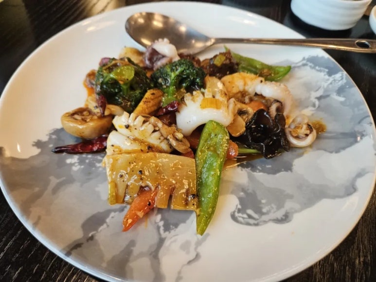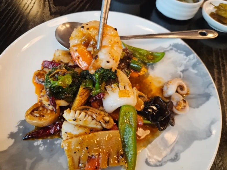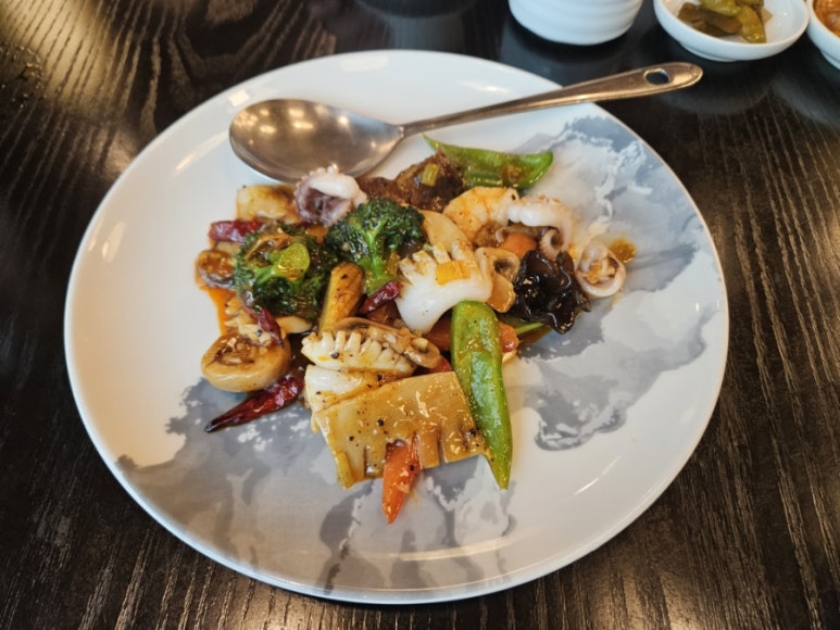 그다음 나온 요리는 팔보채로 여덟 가지 보물 채소 해산물을 넣어 만든 중국식 볶음 요리다. 새우가 엄청 큰 게 들어가 있고 오징어와 브로콜리 죽순 목이버섯이 고추기름에 맛있게 볶아졌다. 동보성이 좋았던 게 간이 강하지 않았다는 것이다. 그러면서 불향도 느껴지고 해산물도 적당히 볶아서 질기지도 않고 채소는 식감이 살아있다.