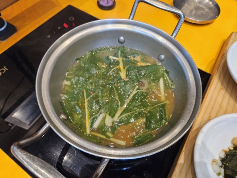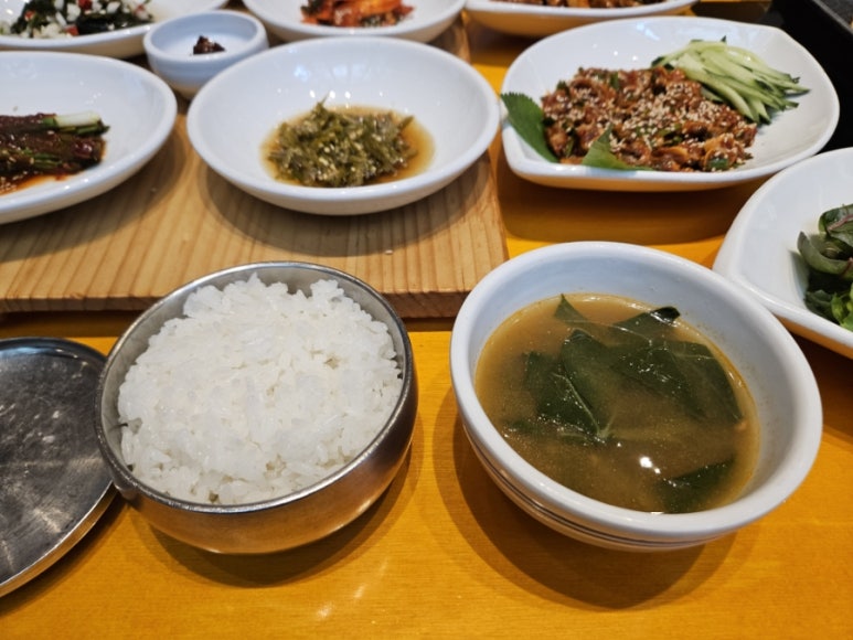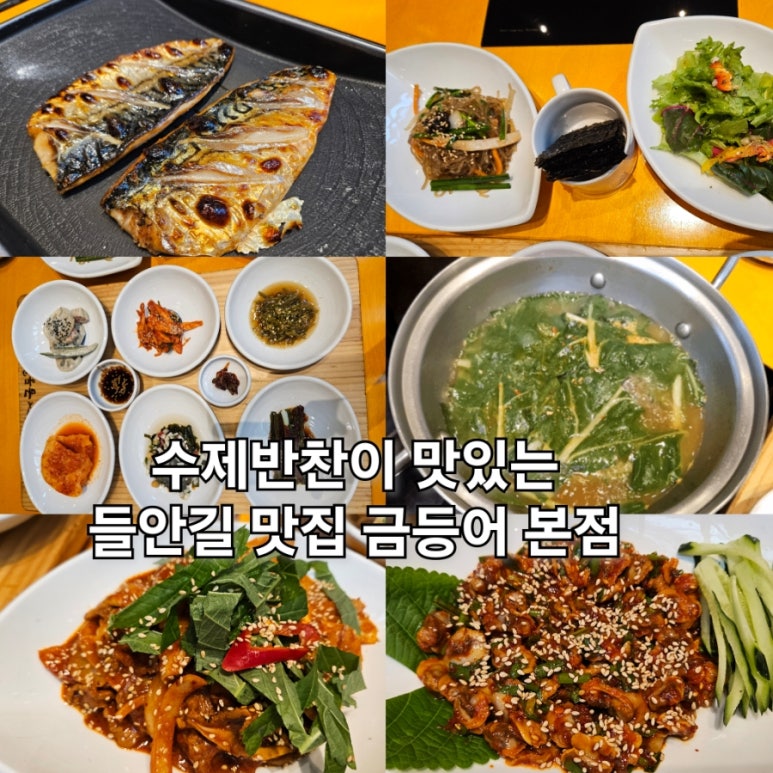 아욱 된장국 국그릇에 담고 흰쌀밥과 같이 놓아주니 건강 밥상 완성이다. 화덕고등어 구이나 제육볶음과 수제 반찬들이 자극적이지 않고 전통적인 한국 밥상의 정석같은 조합이랄까 집밥같은 따뜻함을 느끼고 온 대구 들안길 맛집 금등어다.