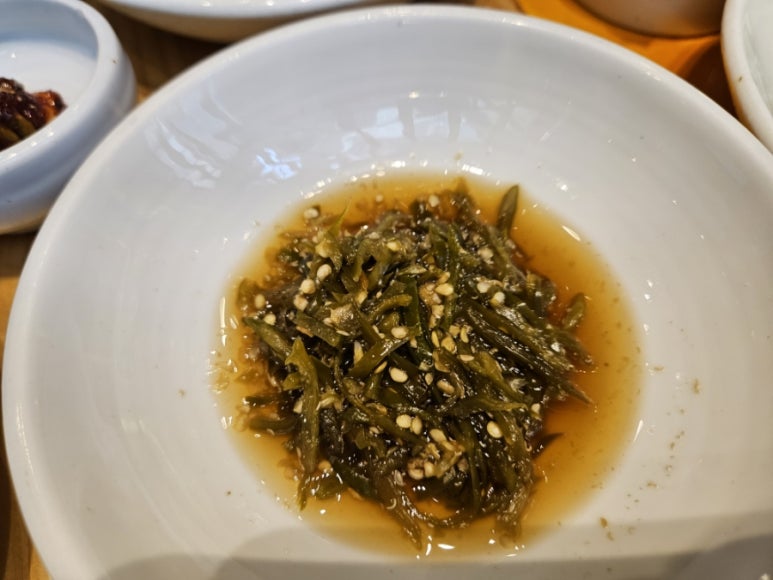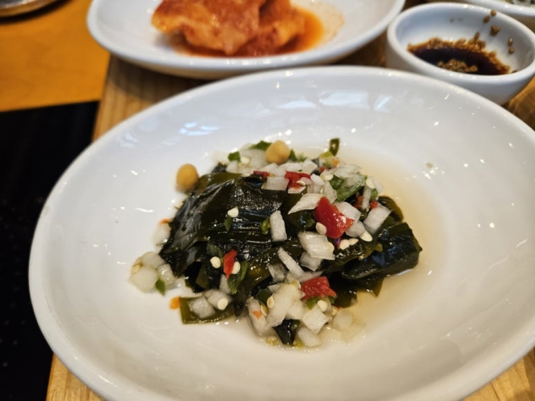 미역무침은 신선한 미역을 데쳐서 다진 양파와 피망등을 곁들여 새콤하게 무친 반찬이었다. 산뜻한 초무침 느낌이라서 고기와 생선과 잘 맞았다.