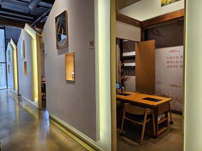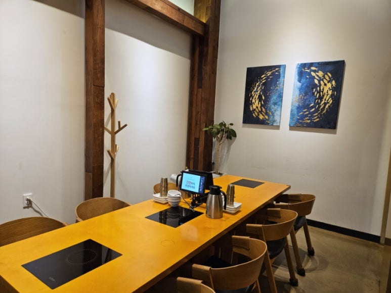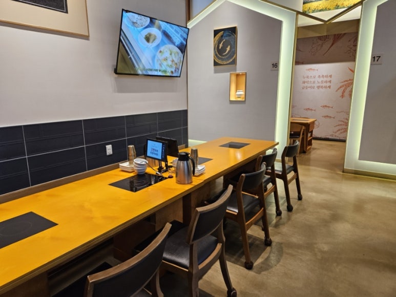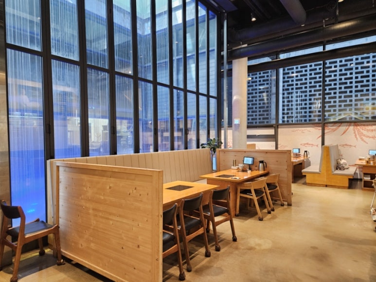 실내로 들어가니 생각보다 더 넓은 편이었고 깔끔하고 현대적이다. 전체적으로 원목 톤의 테이블과 의자 심플한 벽장식이 어우러져 세련되면서 편안한 분위기를 준다.