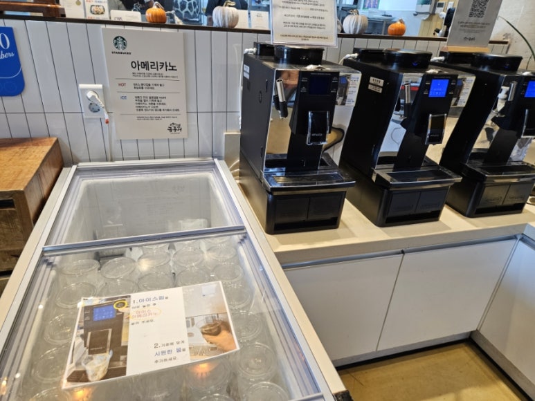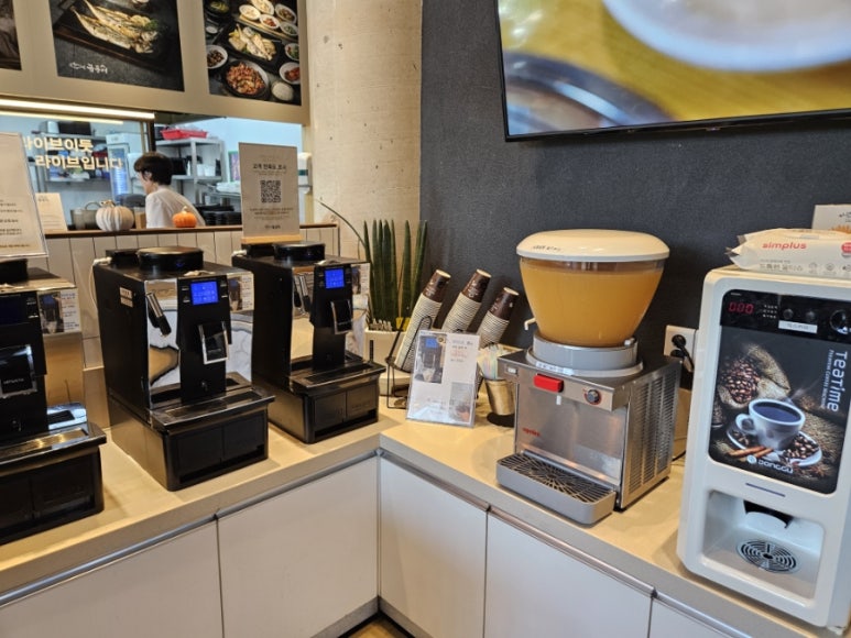 후식코너도 잘되어 있어서 커피도 마실 수 있고 식혜 쥬스도 있다. 작은 카페 같은 공간으로 아이스 아메리카노 먹을 수 있게 얼음컵도 준비되어 있는 모습이다. 커피는 직접 내려서 얼음컵에 냉수와 섞어서 아이스 아메리카노로 즐기면 된다.