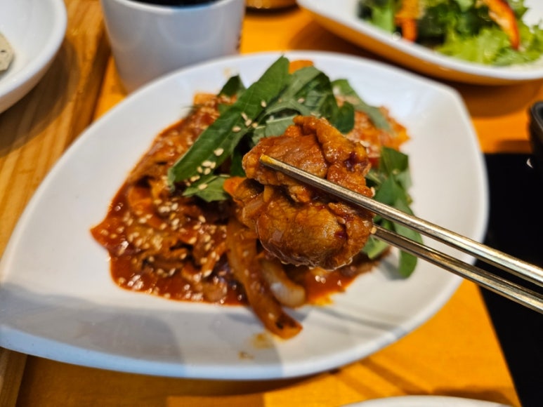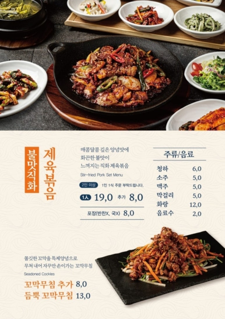 제육볶음은 2인 이상 주문 가능한 세트 메뉴로 제공되며, 1인 기준 가격은 19,000원이다. 더 먹고 싶을 때는 추가 주문 8,000원으로 부담 없이 즐길 수 있다.