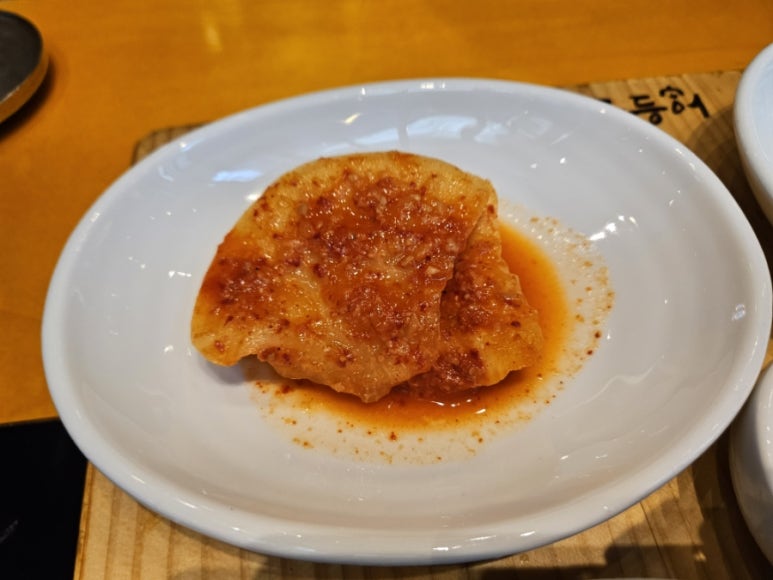 석박지는 좋아하는 반찬인데 큼직하게 썰어낸 무를 고춧가루 양념에 버무려 담근 김치로 아삭한 식감과 시원한 맛이 예술이다. 일반 깍두기보다 조금 넓고 납작하게 썰려있어 국물에 잘 어울리고 씹을때 무의 단맛과 매콤한 양념이 조화롭다.