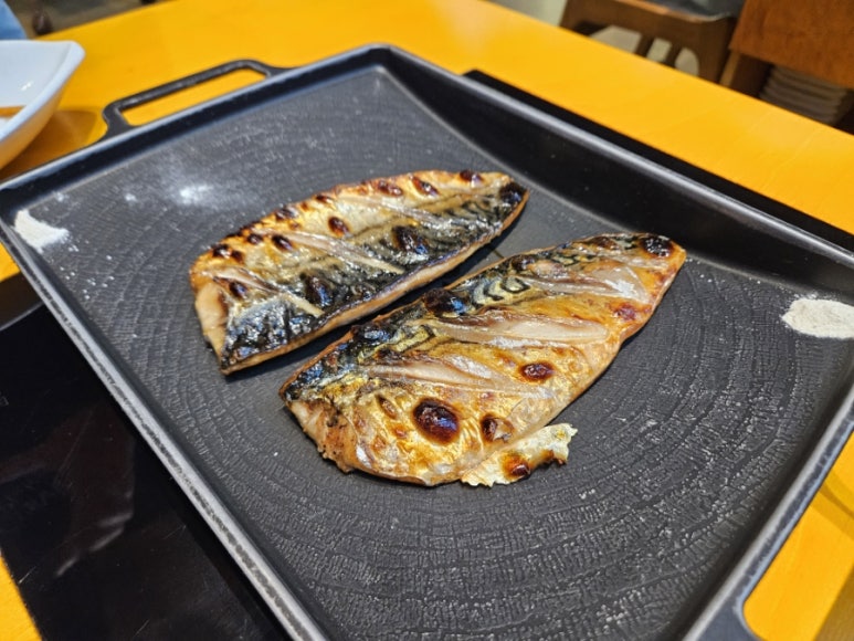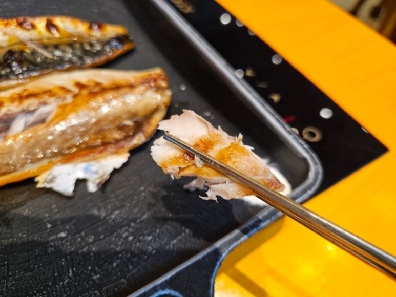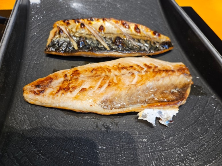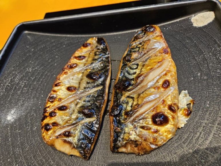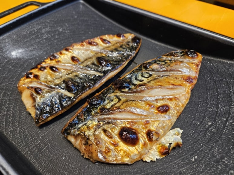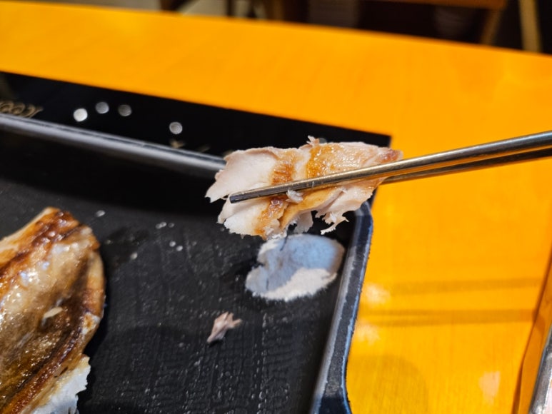 금등어의 메인메뉴 화덕 고등어구이가 빠르게 나왔다. 화덕에 구우니깐 금방 굽히기도 하고 비린내도 싹 날아갔다. 겉은 노릇노릇하게 그을려져 바삭함이 느껴지고 속살은 촉촉하게 수분을 머금고 있다. 화덕에 직접 구워내기 때문에 기름기도 쏙 빠진 느낌이다. 이곳의 고등어는 누룩 소금 숙성을 거쳐 구워내고 있어서 그 덕분에 비린내는 잡히고 감칠맛이 배가 된다.