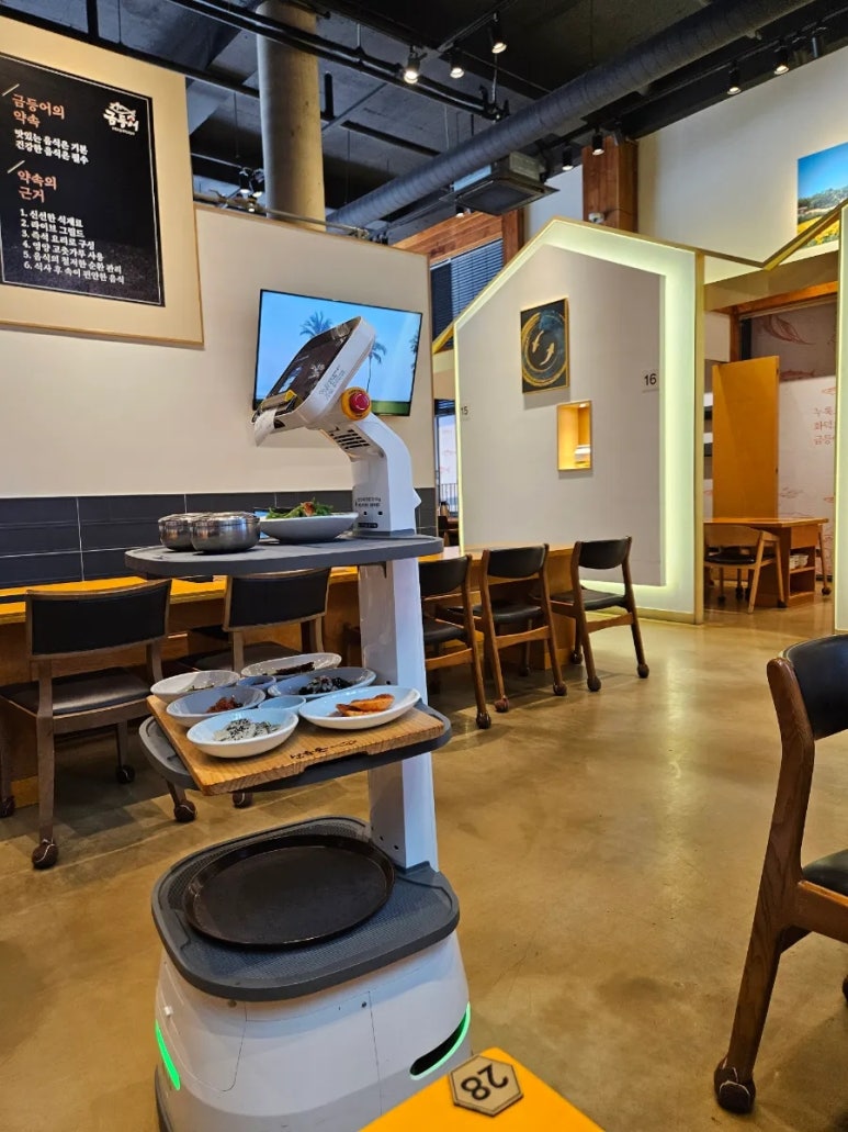 우리가 주문한 메뉴는 화덕 고등어 구이 2인에 꼬막무침, 제육볶음 각 8,000원씩 추가했다. 음식은 로봇이 서빙을 해주는데 친절하게 직원분이 테이블에 세팅도 해주셨다.