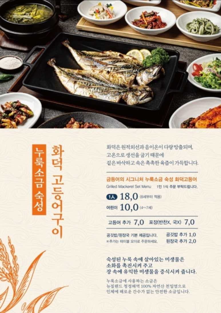 금등어 들안길 본점의 대표 메뉴는 단연 누룩 소금 숙성 화덕 고등어구이다. 화덕에서 고온으로 생선을 굽기 때문에 겉은 바삭하고 속은 촉촉하게 육즙이 살아 있는 것이 특징이다. 메뉴판에 적혀 있듯이 이곳은 단순히 굽는 방식에 그치지 않고, 숙성된 누룩 소금을 사용해 고등어를 간한 뒤 화덕에서 구워내고 있었다. 이 과정에서 고등어 특유의 비린내는 잡히고, 은은한 풍미와 깊은 맛이 더해져 담백하면서도 고소한 풍미를 즐길 수 있다. 가격은 성인 1인 18,000원으로 공깃밥과 된장국이 기본 제공되며, 어린이(4~7세)는 10,000원에 즐길 수 있다.