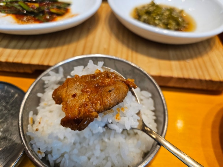 제육볶음 또한 화덕고등어구이 2인 주문하고 추가하면 8,000원에 먹을 수 있기때문에 반찬 더 먹는다 생각하고 주문했다. 금등어가 고등어만 맛있는 게 아니고 제육볶음도 맛있다. 고등어도 먹고 고기도 먹고 괜찮은 선택이다.