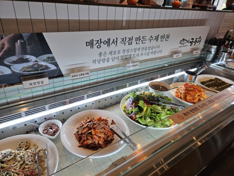 가게에 들어가면 매장에서 직접 만든 수제 반찬이 보이는데 엄청 정갈하게 담겨있는 모습이다. 반찬들은 당일 직접 조리한다고 되어있고 좋은 재료로 정성스럽게 만든다고 하고 집밥 느낌의 반찬들이다.필요한 만큼 반찬을 가져다 먹을 수 있어서 금등어가 인기있는 이유다.