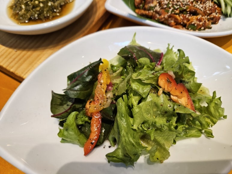 샐러드는 신선한 상추와 치커리 피망등이 들어가있고 유자 레몬 풍미가 느껴지는 드레싱이 화사하고 아삭하고 입맛을 돋우는 샐러드였다.