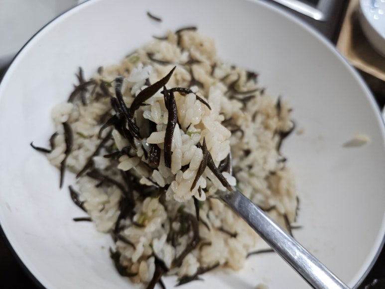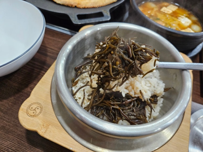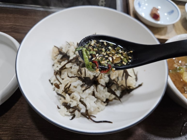 톳밥에 비빔간장 넣고 비비면 톳의 바다향과 씹는 맛이 일품이다. 간장을 비비니깐 바다 밥상의 진가가 완성된다.