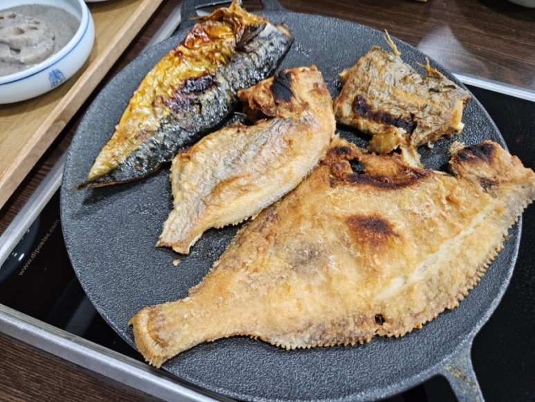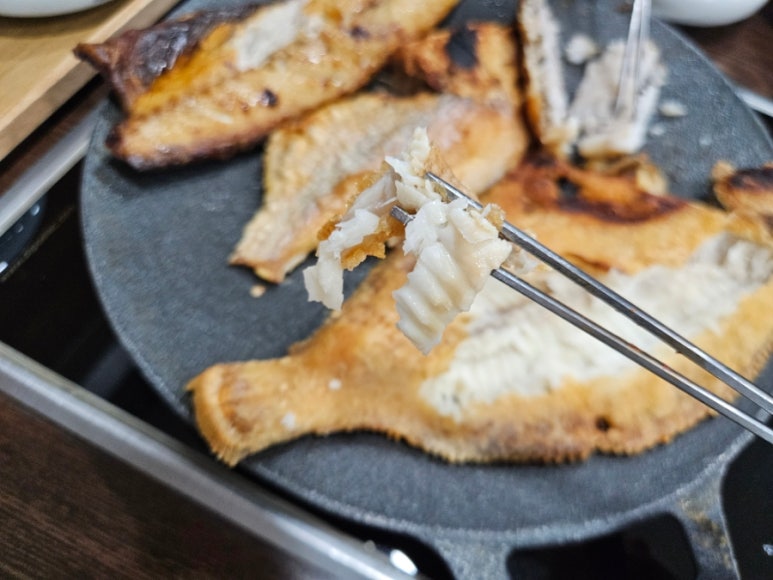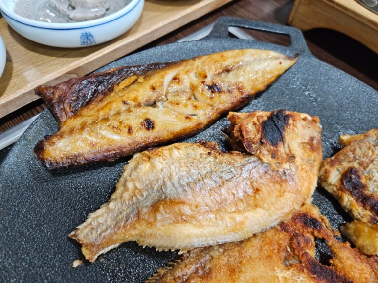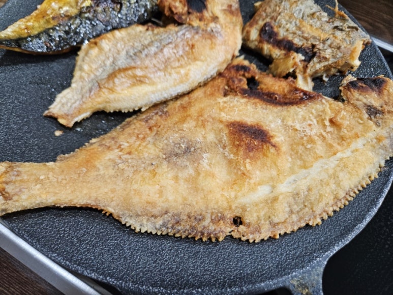 열기인가 살이 두툼하고 탄력이 느껴지는 흰살생선으로 갈치보다 고소하고 단단하나 식감이 있어 풍미가 좋다. 고등어는 오메가3가 풍부한 생선으로 기름기가 있어서 감칠맛이 있다. 친근하면서도 누구나 좋아할 생선인 고등어구이는 대표 밥도둑이다. 가자미는 얇고 넓적한 생선답게 겉은 노릇노릇 바삭하게 익고 속은 부드럽고 담백했다.