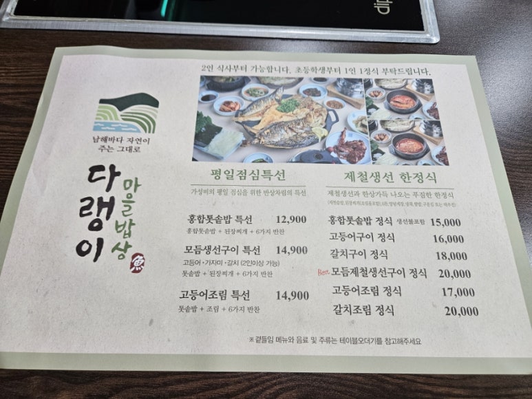 이곳 다랭이 마을 밥상은 크게 두 가지 나뉘는데 첫 번째는 평일 점심 특선이고, 두 번째는 제철 생선 한정식이다.