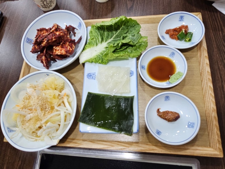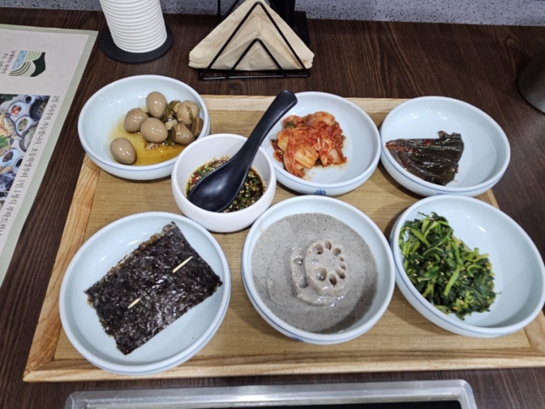 반찬이 먼저 나오는데 양배추와 다시마 갈치속젓 쌈도 나오고 완전 건강식이다. 메추리알 장조림 김치 깻잎김치 기본에 연근 들깨 무침과 나물 반찬 반찬이 다양하고 푸짐하게 나오는데 집밥 먹는 기분의 구성이라 더 좋았다.