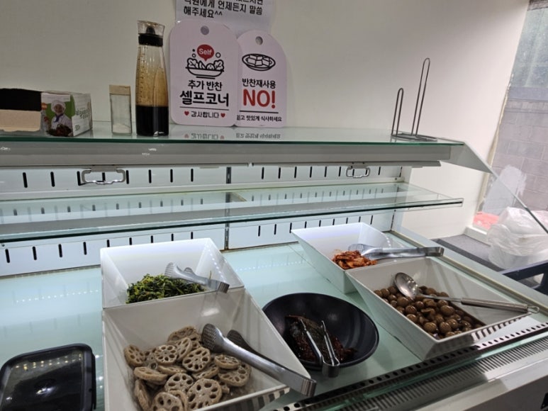 한쪽 편에는 반찬을 더 가져다 먹을 수 있는 추가 셀프 코너가 있다. 연근무침 메추리알 장조림 나물 반찬이 있었다. 반찬이 맛있었는데 리필이 가능하니 더 만족스럽다.