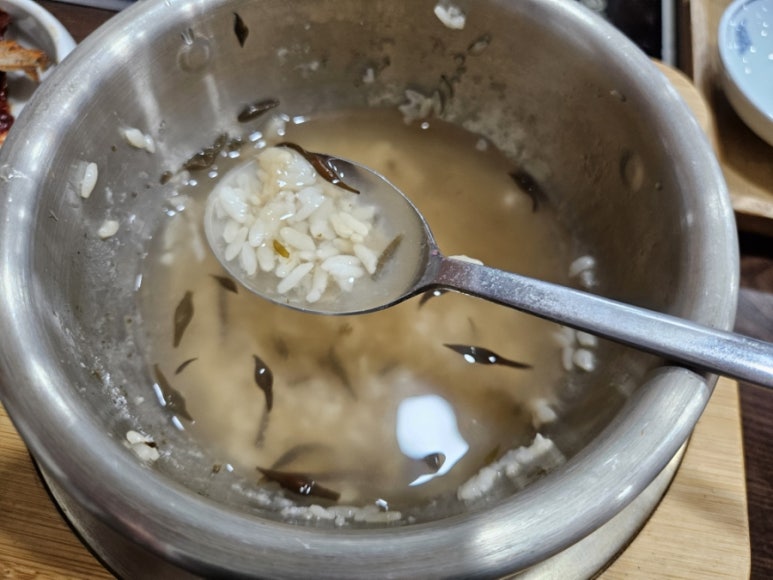 마지막으로 먹은 숭늉은 미더덕해물된장국과 같이 즐기니 싹싹 긁어먹게 된다. 완전 구수함 그 자체다. 숭늉까지 남김없이 즐겼다. 맛도 좋고 양도 좋고 알차게 먹고 온 다사 맛집 생선구이집으로 끝까지 숟가락 멈출 수 없는 한 끼로 숭늉으로 깔끔하게 마무리하며 속까지 든든했다.