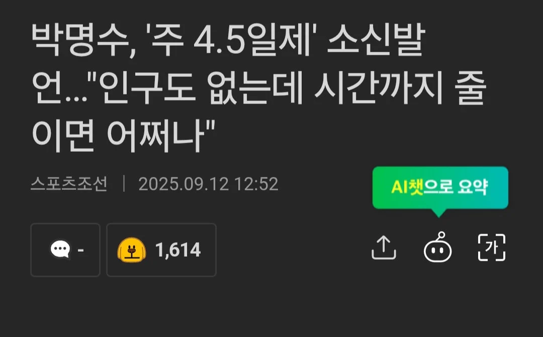 주 4.5일제 발언 때문에 민심 박살난 박명수 이슈야 이슈야 2025년 09월 14일 오전 10:00 조회수 4 공유 글씨 축소 A 글씨 크기 초기화 글씨 확대 https://news.nate.com/view/20250912n16131?mid=e0600 댓글에 욕밖에 없음.. 140억 벌었는데 어디쓸지 모르는 사람 후기 송도 건설중인 기업 사옥들 수면 부족 및 과로 했을때 주의할 점 취업 안하는 딸 때문에 죽을 맛이라는 엄마 명나라 황제도 못참고 칙서3통보낸 것